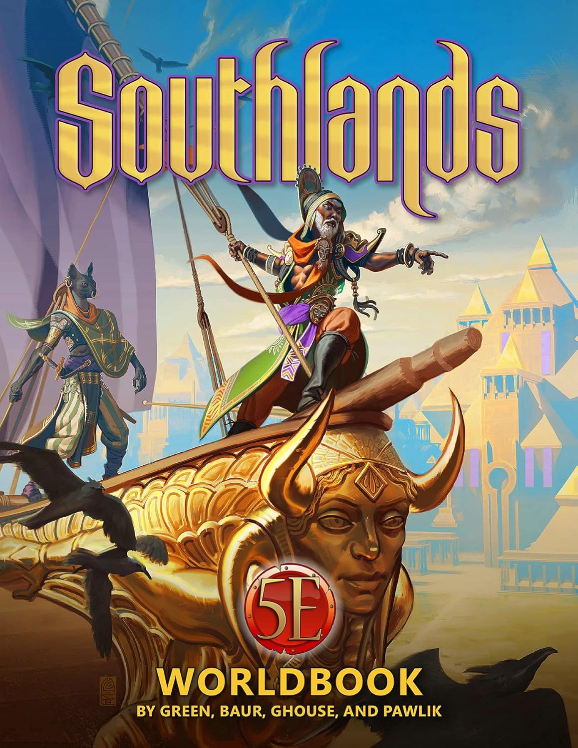 In the Southlands, the world is alive with elemental power and wondrous magic, ancient god-kings walk among the living, and empires at their height echo the mystery and majesty of the past. This campaign setting for the 5th Edition of the world’s first RPG is ripe with possibilities for adventure in ancient tombs, enormous jungles, and searing deserts, where swift-flying sand ships dart between distant cities. A fan-favorite portion of the Midgard world, the sprawling Southlands include the legacy of jinn, the domains of gnolls, the ruins of minotaurs, the gifts of god-kings, and many more rich stories perfect for pulp adventure campaigns. The setting is fully compatible with the 5th Edition ruleset.