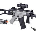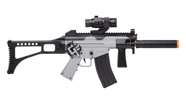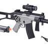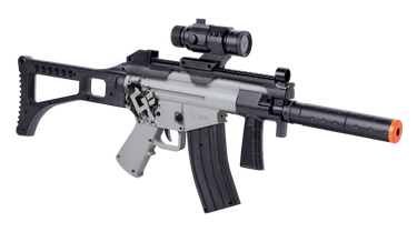 Rifle Features: * Up to 300 FPS * Full-auto * Adjustable hop up * 300 round magazine * Picatinny mounting rails Pistol Features: * Up to 280 fps * Single shot * Quick release – 15 round magazine * Fixed front & rear sights Kit includes: starter set of BBs and safety glasses