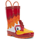 Add a splash of fun to rainy days with the Kid's Ritz Rooster Rain Boot! This waterproof boot, featuring a bright red 3D rooster character, is designed to keep little feet dry and warm. The self-dressing Puzzlepairs insole and pull-on loops make these boots a delight for independent kids.
