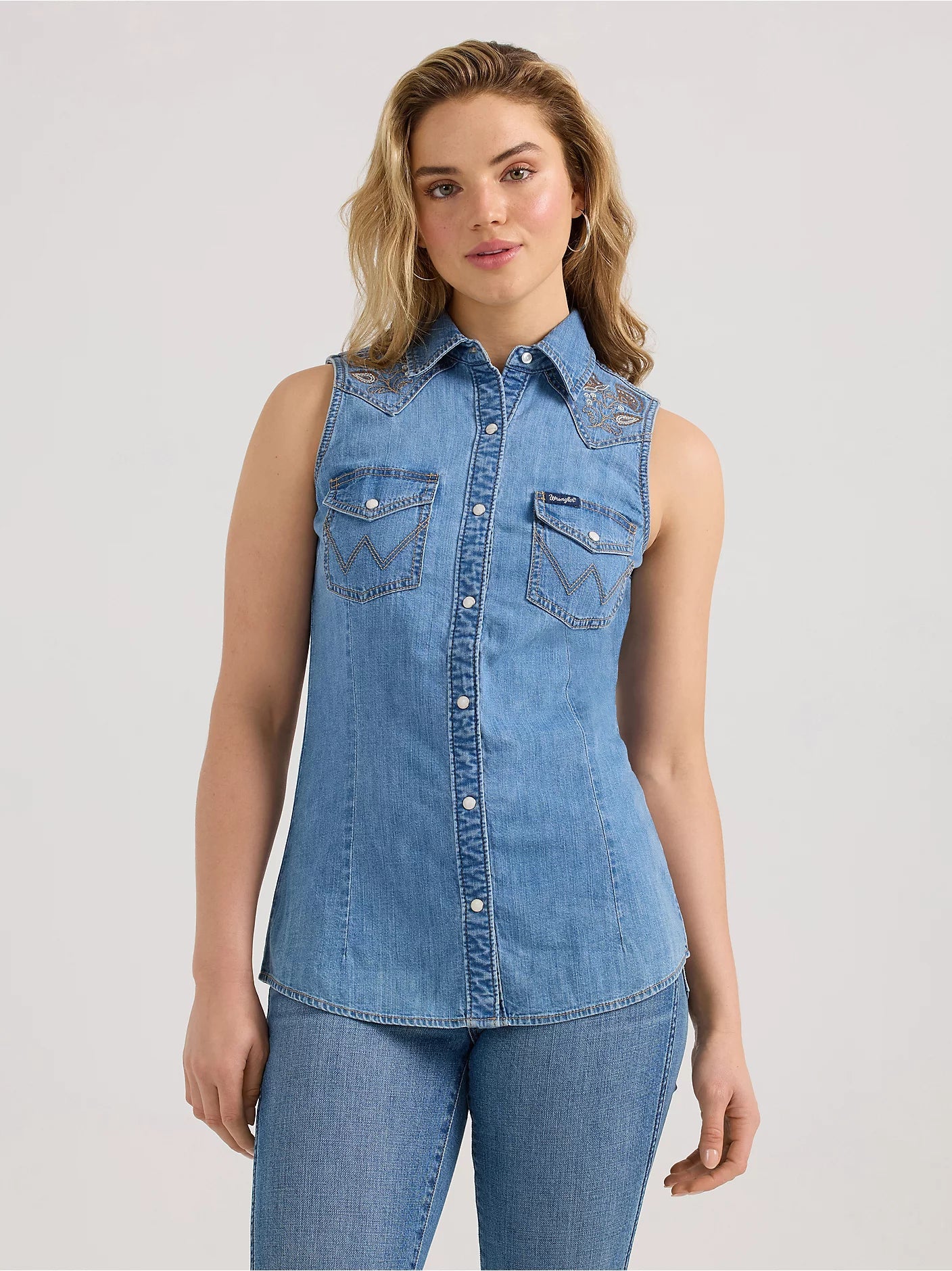 Expertly designed for warm weather, this Wrangler® women's denim snap shirt features classic Western details like front pockets, floral embroidery, and pearl snaps. With a slim fit and cotton fabric, it offers all-day comfort and effortless style. A stylish choice for any cowgirl, perfect for casual outings or more formal occasions.