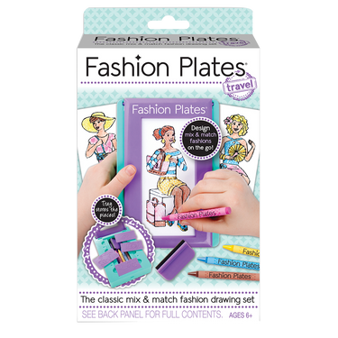 Create fabulous designs on the go with the Fashion Plates Travel design set! This portable Fashion Plates set is the perfect take-along size and featires mix and match travel-themed Fashion Plates, crayons, paperm and a built-in storage compartment. However you get there, now you can be creative anywhere!