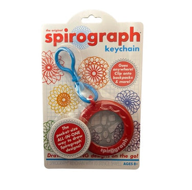 Make spirographs anywhere and everywhere you go! Just clip the Spirograph® Keychain to your bag, backpack, or lanyard. The small design measures 2 ½" and will fit snuggly in your pocket. Includes one spirograph stencil with 10 shapes and features a built-in design that allows you to trace without slipping! Includes basic instructions and recommended designs on the back.