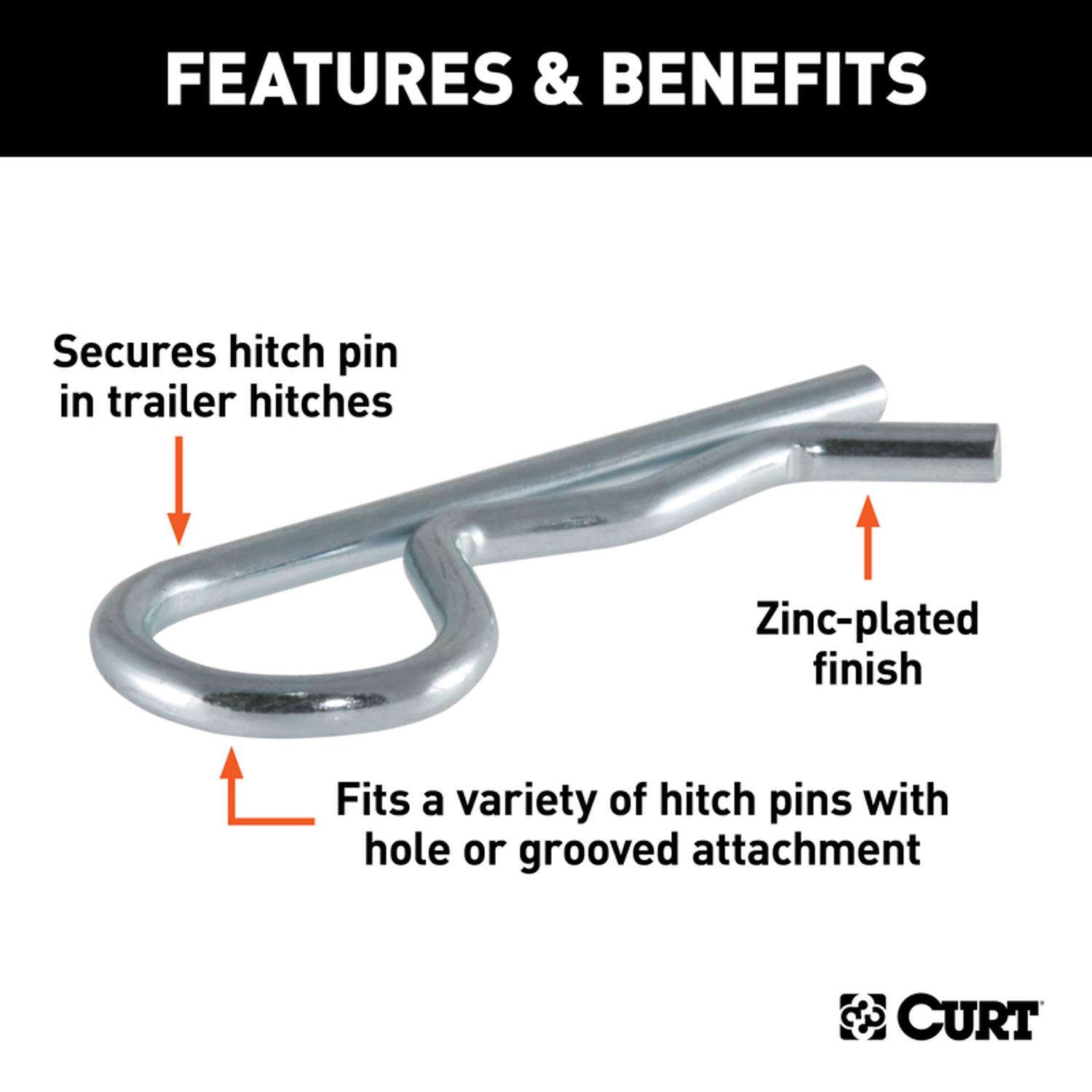 When you mount a ball mount on your trailer hitch, you expect it to stay put. Whatever type of load you are hauling, having towing equipment that can work as hard as you do is a must. For all types of heavy-duty towing, Curt 5/8" hitch pins and clips pack a little extra punch. We make our 5/8" hitch pins out of solid steel and coat them in one of four finish options. All of these finishes offer excellent resistance to rust and corrosion for long-lasting, smooth operation. Curt hitch pins are also constructed with a 105-degree bend, creating a useful handle for a better grip and allowing the pin to stay securely engaged in the trailer hitch and ball mount. This particular 5/8" hitch pin features a zinc finish and comes with a standard retainer hole to accept the included clip. It provides reliable installation for any ball mount or hitch-mounted accessory with a 2" shank. It also has a vinyl-coated handle on both the hitch pin and clip to allow for a better grip.