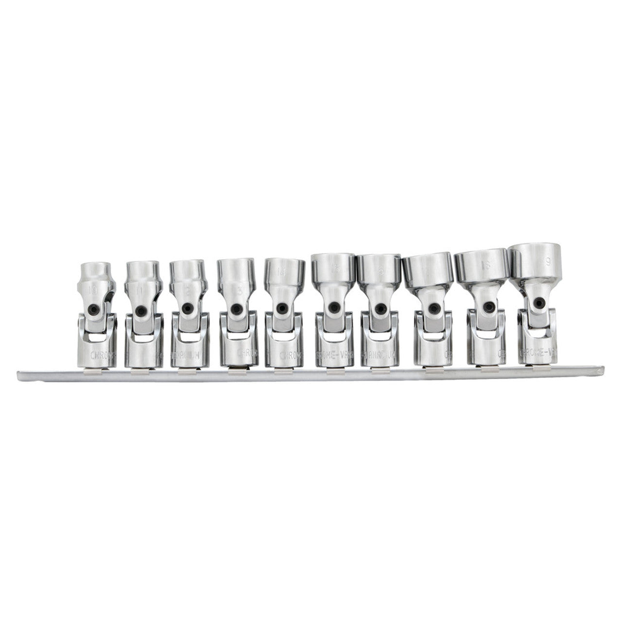 10-piece metric flex socket set with 12-point recessed edges. Crafted from durable chrome vanadium steel. Featuring large stamping for easy identification.