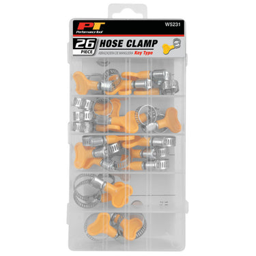 26-piece key type hose clamp assortment that comes in a handy storage case. Easy to turn keys that tighten securely.