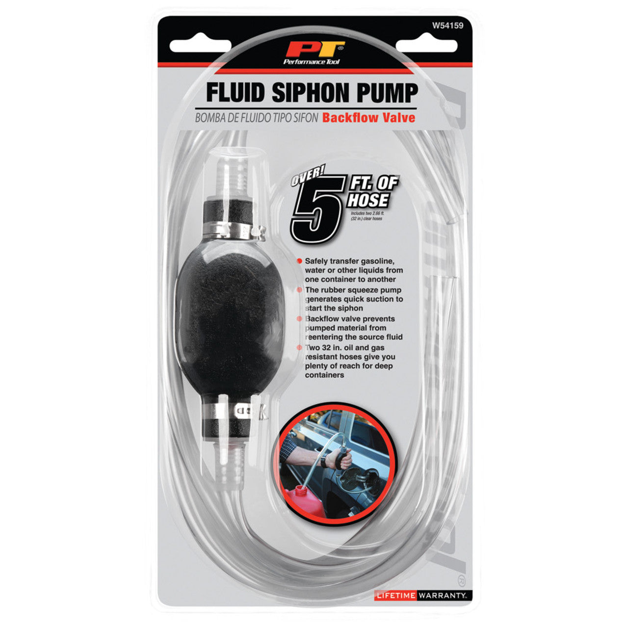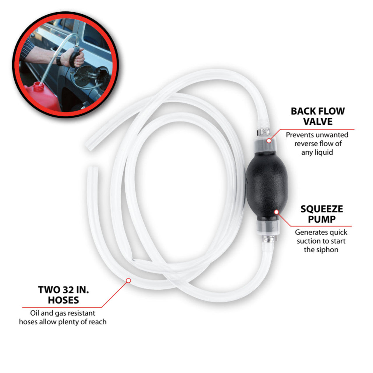 Safely transfer liquids with this siphon hose that features a back flow valve and a rubber squeeze pump to generate suction. Two 32-inch oil- and gas-resistant hoses.