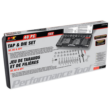 40-piece tap and die set that includes a variety of SAE sizes. Comes in a blow-molded plastic storage case.