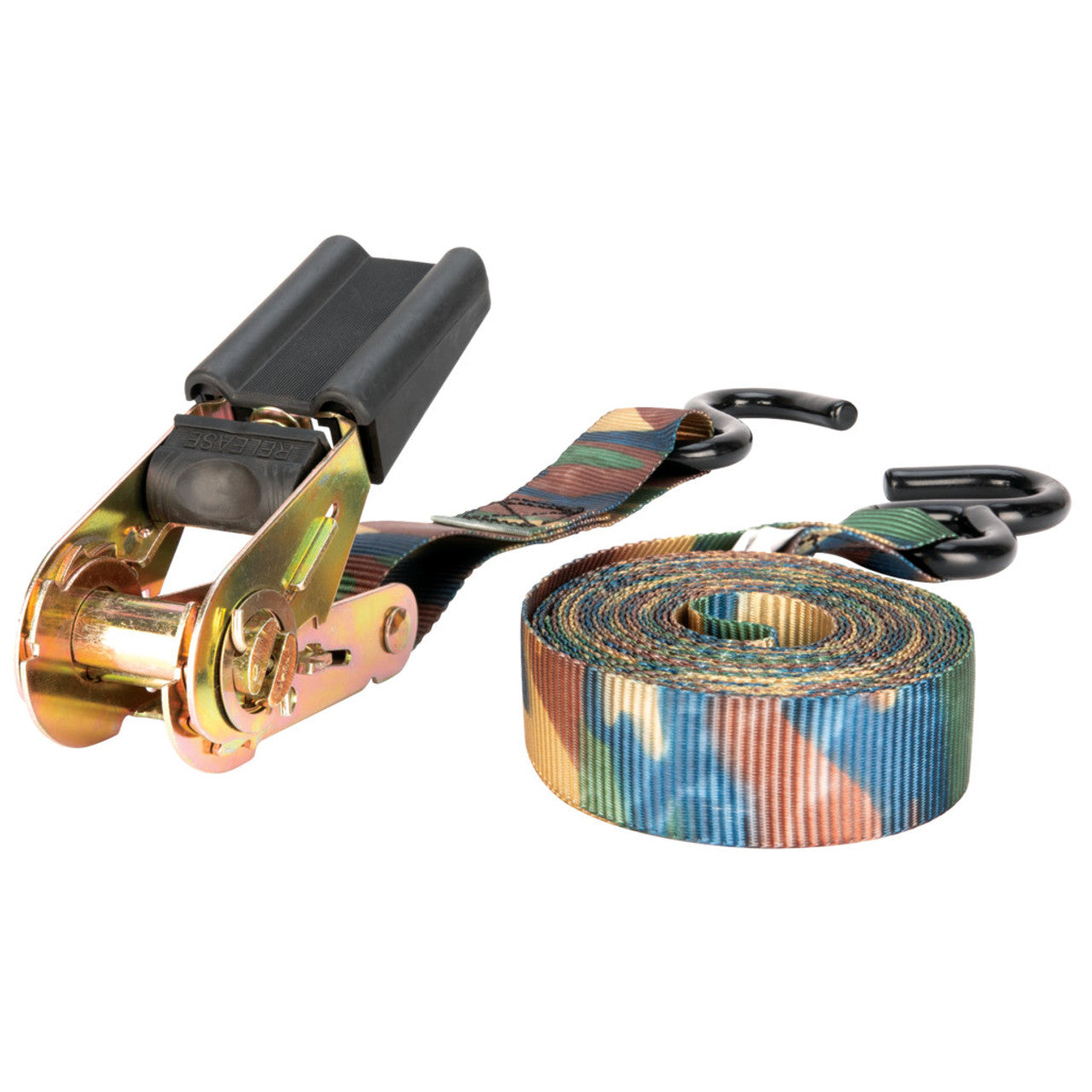 Four 15-foot tie-down straps with a ratcheting mechanism and padded handles. Features olive camouflage webbing.