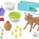 - Storytelling accessory pieces include 2 dough colors, mold, shovel, bucket, basket, apple treats, feeder, baby calf, bunny, 2 hens and 6 chicks.