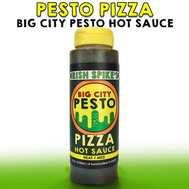 This is our pesto pizza hot sauce, but why stop at pizza?! Try it on pasta, in spaghetti sauce, meatloaf, salads, sandwiches, eggs, even tacos! Let the garlicky, herbaceous goodness of this sauce be your guide!