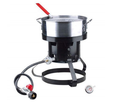The 18'' tripod cooker stand has a wide, stable base with 3 additional stabilizer feet. The heavy-duty 10 quart aluminum fry pot measures 12'' across and features dual side handles. Lightweight strainer basket comes with a rubber coated handle for comfort and a clip at the rear base to allow you to drain the food you fry or boil. Durable high efficiency burner cranks out 41,000 BTUs.