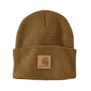 A plaited knit design gives this men's Carhartt beanie a traditional handknit look. The soft acrylic rib knit features a stretch fit to seal in warmth. A leather patch accents the cuff.