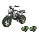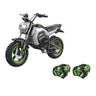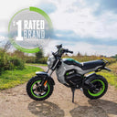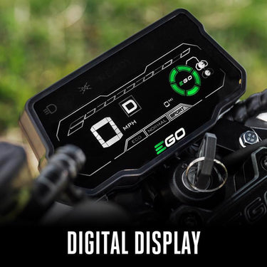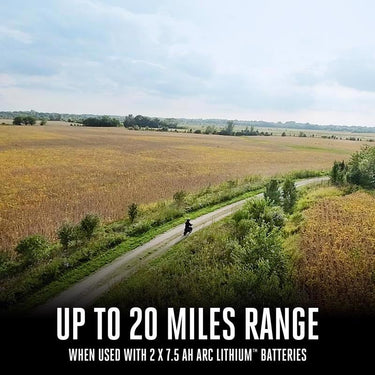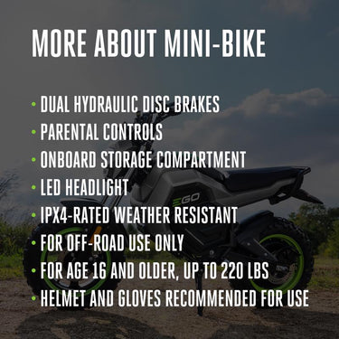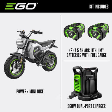 The EGO POWER+ Mini Bike with Peak Power technology combines the power of any two EGO POWER+ 56V ARC Lithium batteries to deliver quiet acceleration from its powerful hub motor with top speeds up to 28 MPH. Get up to 20 miles of range on a single charge with two included 56V 7.5Ah ARC Lithium batteries. Three driving modes including ECO, Normal, and Sport with parental controls deliver a fully customizable riding experience. Full suspension in the front and rear is included for a comfortable ride across any terrain while dual hydraulic disc brakes provide powerful stopping performance. Off-road tires with an aggressive tread invite you to embark on any adventure. For off-road use only by riders ages 16 and older, up to 220 pounds. Helmet and gloves recommended for use.
