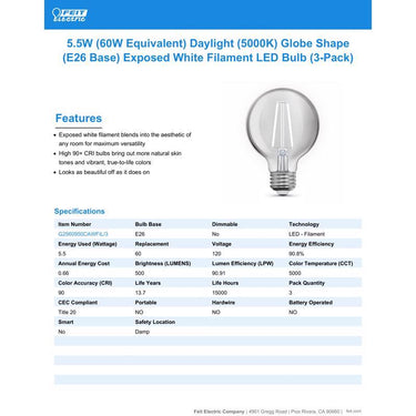 Upgrade your lighting to Feit Electric's elegant Exposed White Filament LED Light Bulbs for a fresh take on decorative bulbs. These first-of-their-kind bulbs take a traditional globe shape bulb with exposed filament encased in clear glass and add lower-profile white filaments. Unlike yellow filaments, these blend into your current decor, for a timeless look that complements any room. They give off a 5000K Daylight White glow ideal for craft rooms, bathrooms, kitchens, laundry rooms, and anywhere you desire invigorating light. These bulbs can be utilized with any medium E26 base fixture such as string lights, pendant lights and floor lamps. The G2560950CAWFIL/3 emits 500 lumens while only using 5.5 watts of power, up to 90.8 percentage less energy than equivalent 60-watt incandescent bulbs. Create a stylish feel that instantly enhances any home or commercial space.