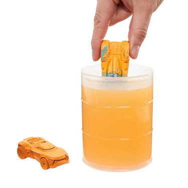 - For the initial reveal, use the reusable barrel packaging as a dunk tank, fill it with water and swirl the car in it. Watch as the water changes color and a new deco is revealed on each vehicle!