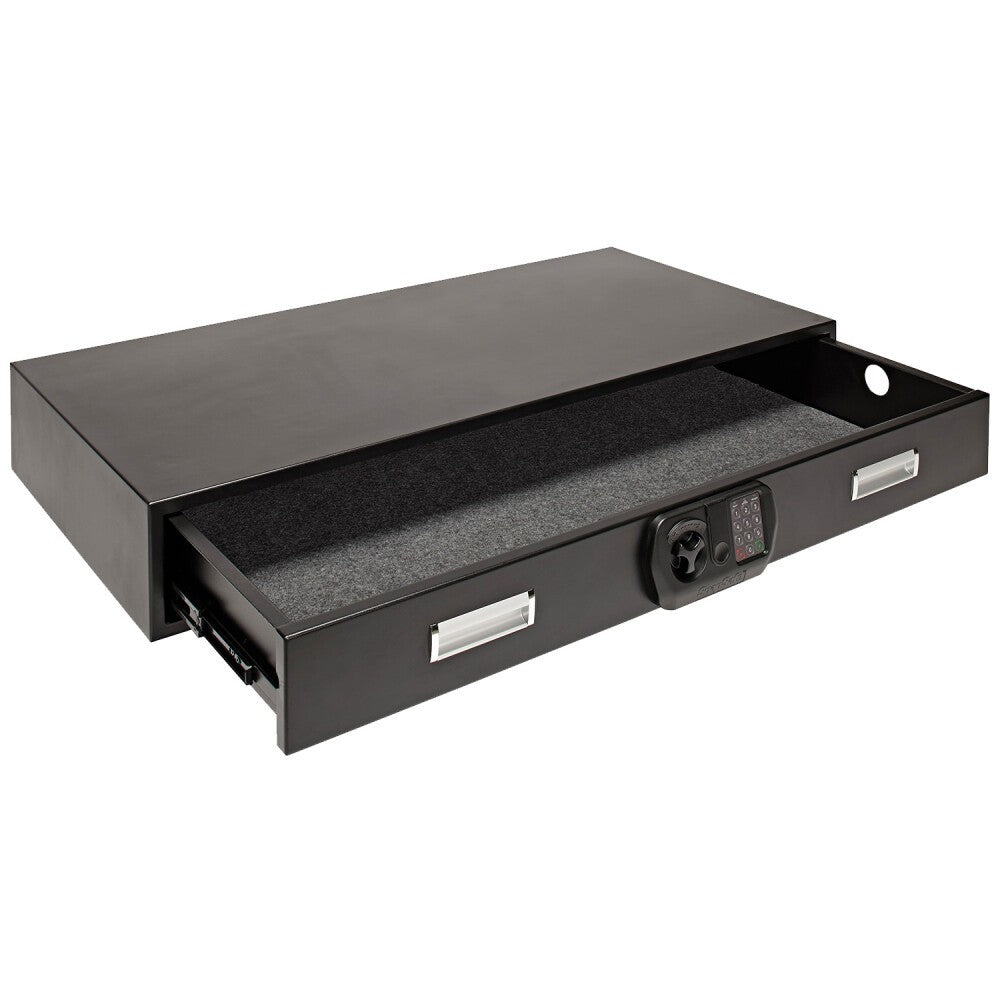 Fill that empty void in your life, or under your bed, with an under the bed safe from SnapSafe. The SnapSafe Under Bed Safe is constructed of 14-gauge heavy-duty steel with a digital lock and pry-resistant door, to keep your valuables safe from children or other unauthorized individuals. The slide-out drawer makes access to your valuables easy and convenient. The Under Bed Safe has pre-drilled holes for permanent installation and a 5' security cable for less permanent installation with retention capabilities.