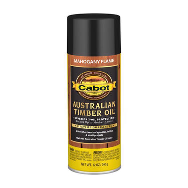 Get the strength of Cabot Australian Timber Oil in an aerosol spray can. Penetrate even dense exotic hardwoods in just one coat. With superfine pigments that never peel and resist brush marks, you will be able to enjoy a choice of 4 rich colors that will not fade or scuff for years to come.