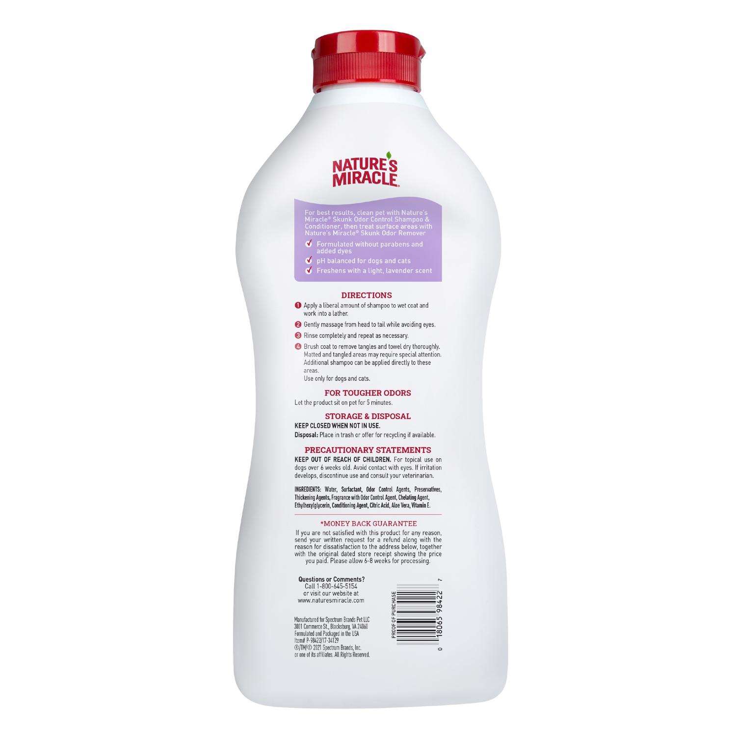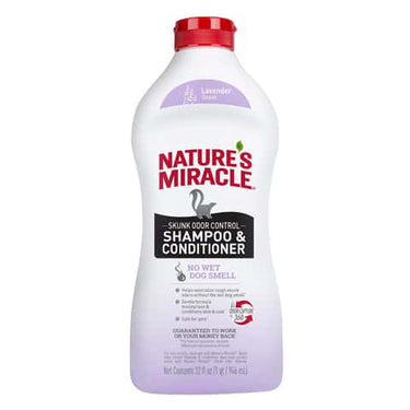 Whether it happens to you, your pet or your home, few experiences are as daunting as being sprayed by a skunk. Nature's Miracle Skunk Odor Control Shampoo and Conditioner helps remove skunk odors from pets. The fast-acting formula safely helps neutralize odors on contact, when used and stores as directed, leaving a fresh lavender scent behind. Safe to use around pets and homes when used as and stored as directed - see product label for use and handling instructions.