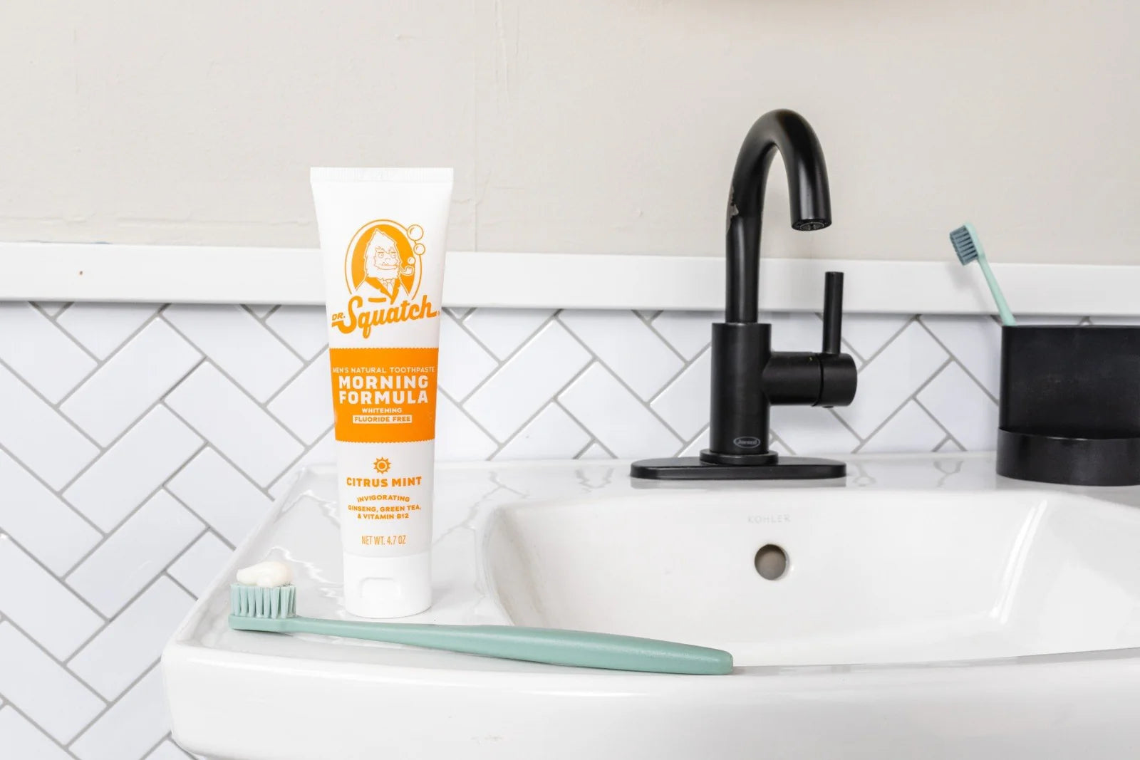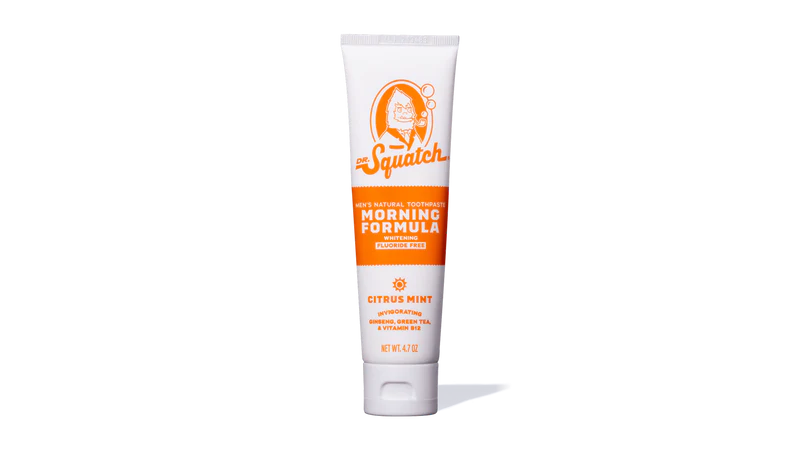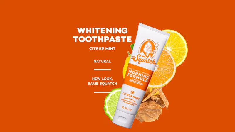 Dr. Squatch natural toothpaste for men is formulated specifically for your morning and night routines. Free from harsh chemicals sulfates and parabens our morning and night toothpaste duo fights sensitivity and supports enamel health around the clock with Hydroxyapatite a natural calcium-based mineral identical to tooth enamel. Morning: Citrus Mint blasts away morning breath with a burst of Peppermint. Green Tea Extract and Vitamin B12 give you the invigorating kick you need to start your day like a champion while Ginseng supports your manly health. We’ve got you covered all day with a lasting clean from Tea Tree oil and enamel support from Hydroxyapatite.