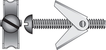 Toggle bolts come with spring-action wings and are intended for anchoring into hollow walls. The wing is designed to spread apart behind the base material upon installation for firm hold in hollow wall applications. The wing disperses the weight of the secured item over a larger area, increasing the weight that can be secured compared to a regular bolt. *