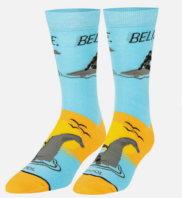 If you believe in all the strange and odd myths and creatures, then you'll love these Believe crew socks. These blue socks feature a graphic knitted image of Bigfoot riding on the back of the Lochness monster. Each pair of socks is designed with a 100% premium cotton blend with a double padded bottom for extra cushion, complete with an extended cuff to prevent sliding.
