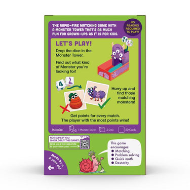 Perfect for 2-6 players ages 4+, Monster Match is the fast and fun family game that puts your matching skills to the test. Throw dice in the Monster Tower to reveal what kind of monster to find. If you find a matching monster, hurry and place your finger on the card. The person who ends up with the most cards wins. Kids love giggling over the adorable monsters, playing with the Monster Tower, and racing to spot a match. Grown-ups love how their little ones are secretly learning counting skills and pattern recognition. Everyone's having a monstrously good time with Monster Match.