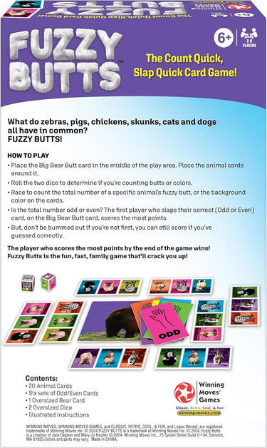 The object of this quirky, high-energy family game is to earn the most points by quickly and correctly counting up specific animal butts or specific colors on the cards. Next, decide whether the total is an odd or even number. Then, try to be the first player to slap your Odd or Even card onto the Big Bear Butt. You’ll score more if you slap down the correct card and score even more if you’re the first to do so. The player who scores the most points by the end of the game (10 speedy rounds) wins!