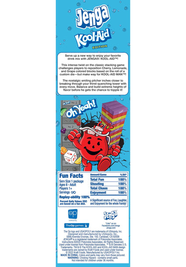 Description:   Jenga, Oh YeahWhat's better than Kool-Aid and Jenga? Them all mixed together in this officially licensed??Jenga Kool-Aid Edition! You will have a blast at the next family game night???just don't shake the table. The Kool-Aid is always busting through walls and stuff, so don't be like him. However, you have to love the smile. If you are a fan of Jenga and Kool-Aid (who isn't?), check out this??Jenga Kool-Aid Edition game.