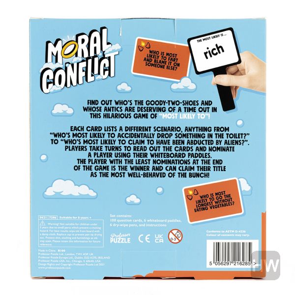 Each card lists a different scenario, which might be anything from “Who’s most likely to drop something in the toilet accidentally?” to “Who’s most likely to claim to have been abducted by aliens?”. Players take turns to read out the cards and nominate a player using their whiteboard paddles. The player with the fewest nominations at the end of the game is the winner and can claim their title as the best-behaved of the bunch!