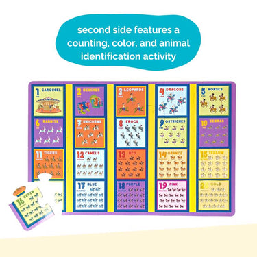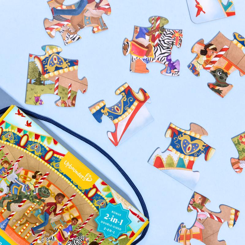 Around And Around We Go. Whimsical and sweet, Upbounders Joyful Carousel Animals Numbers and Colors 2 sided 24 Piece Puzzle is two times the fun. This first puzzle for kids depicts magical designs from a real-life inspired carousel on one side, with a second side featuring a counting, color, and animal identification activity for toddlers.