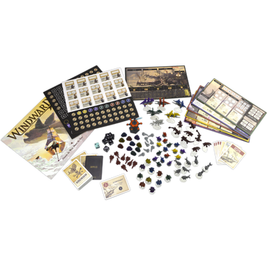 Contents: 6 Double-Sided Board Tiles, Trading Post (with Flag), 5 Ship Status Boards, Trading Post Board, 5 Ship Pieces, 10 Longboat Pieces, 10 Mate Pieces, 10 Achievement Tokens, 15 Status Trackers, 8 Grey Cresters, 8 Red Cresters, White Crester, 8 Grey Crester Teeth Pieces, 8 Red Crester Teeth Pieces, 8 Black Battle Dice, Blue Wind Die, 58 Card Supply Deck, 15 Crew Tiles, 100 Gas/Cannon Tokens, 16 “+2” Tokens, 5 Coffee Tokens, 6 Naturalist Tags, 11 Life Tokens, 8 Achievement Cards, Rules.