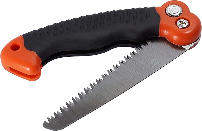 The Sona 10.5" Folding Camping/Pruning Saw - PS185 is a super sharp and effective tool for cutting, pruning, and sawing. The high visibility black and orange colored plastic handle is ergonomically curved handle for a comfortable hold. The handle is also knurled for a sure, non-slip grip. The triple teeth saw blade is made of 65Mn carbon steel and is 1.2mm thick.