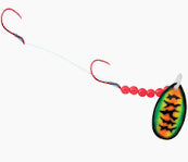 Walleye harness rig designed for trolling. Pre-snelled for tipping with leech or worm. Unigue "tiger" finishes. UV produces like no other in low light, cloudy or murky water.