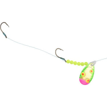 Walleye harness rig designed for trolling. Pre-snelled for tipping with leech or worm. Unique tiger finishes. UV produces like no other in low light cloudy or murky water. Available in two models and seven colors.