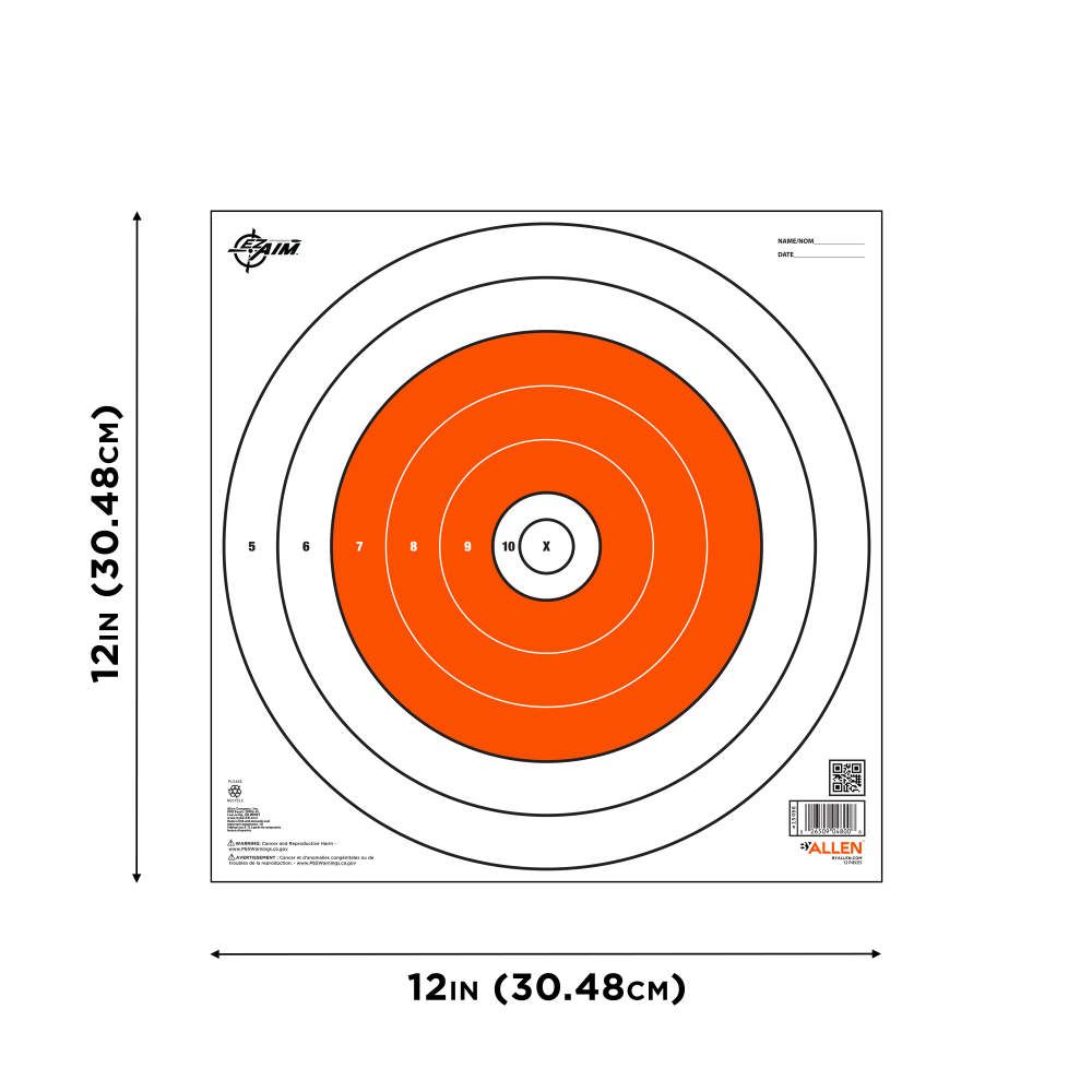 The EZ Aim® 12" Square Paper Bullseye Targets provide you with a white 10-ring target. Special paper cuts a clean hole for most accurate judgement of three or five shot groups. 12 x 12 inch Target surface, Target is 12.5 x 12.5. Two color print.