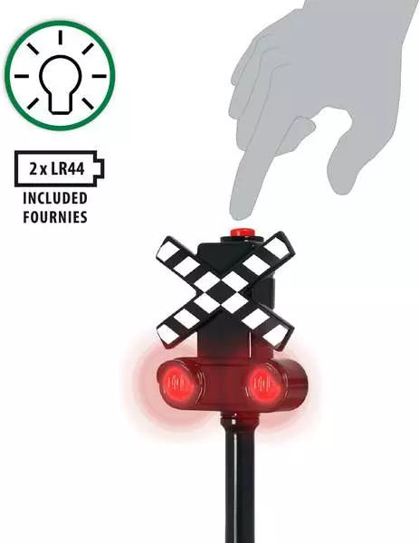 Warning – a train is passing by! Push the button on the railway crossing sign, start the red blinking light and let the train pass safely by. Well done! Let’s do another round. You’re in charge of the light signal, which is an important job.