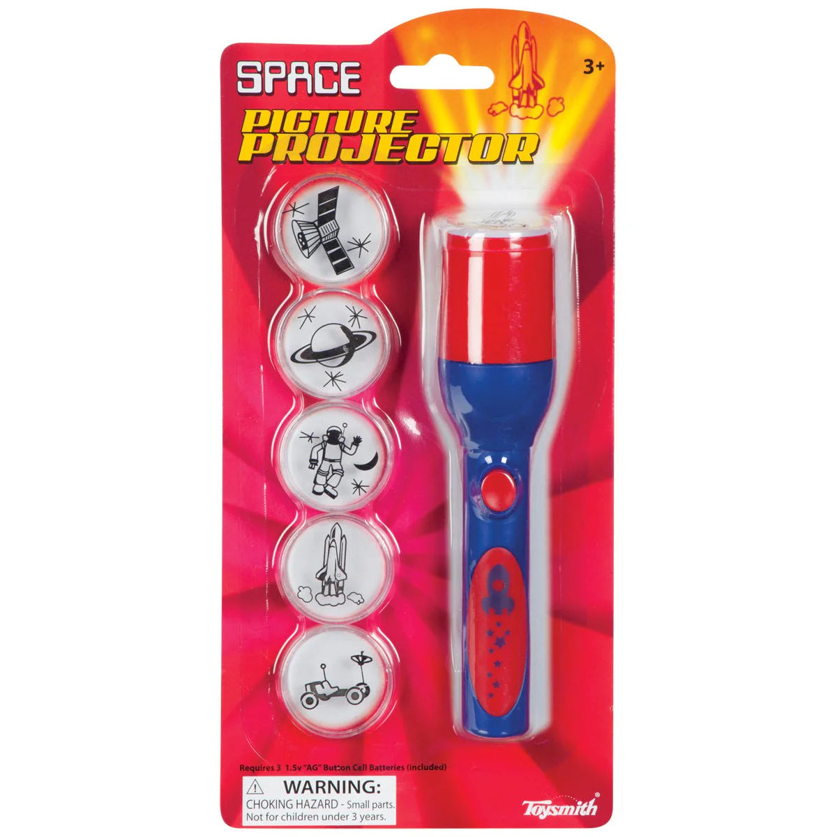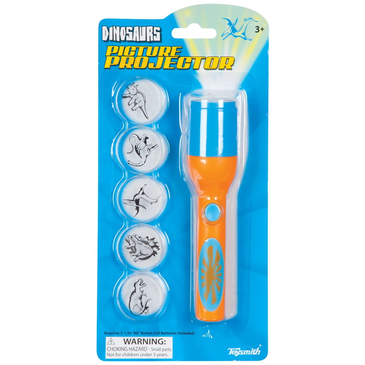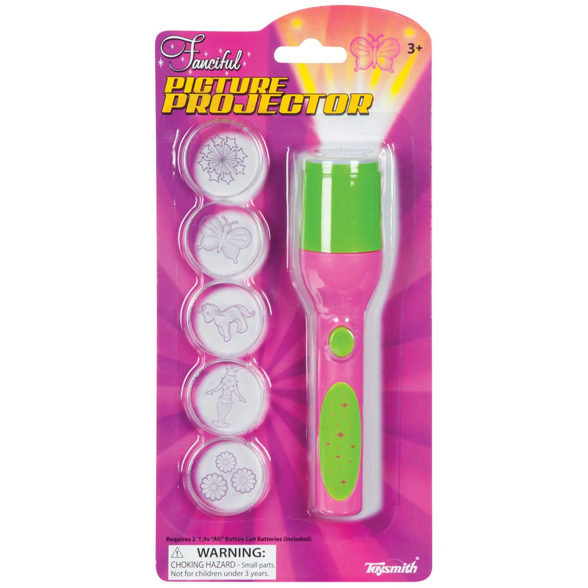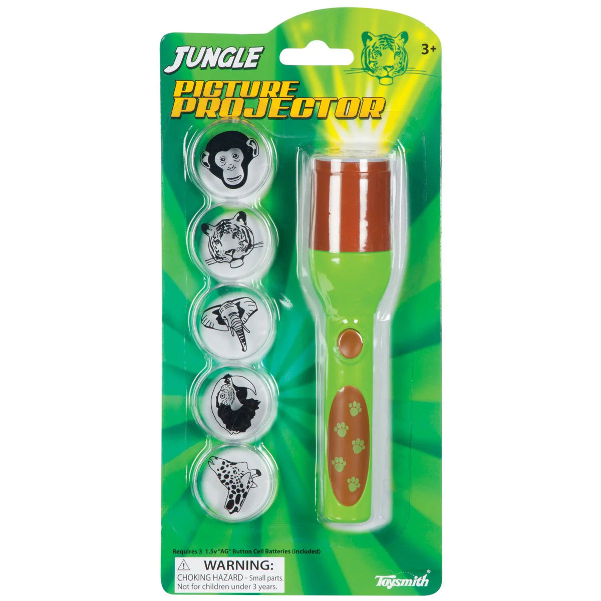The Mini LED Picture Projector from Toysmith is a fun handheld flashlight for kids with attachable image covers. Comes in 4 different themes and colors. Theme options include Jungle, Dinosaur, Space, and Fanciful. Each Mini LED Picture Projector toy includes 1 handheld, button-activated LED light and 4 detailed image covers. Image covers may include dinosaurs, butterfly, unicorn, mermaid, flowers, giraffes, elephants, astronauts, planets, and more. Requires 3 1.5 V AG button cell batteries. Assortment of 24 includes 6 of each style.