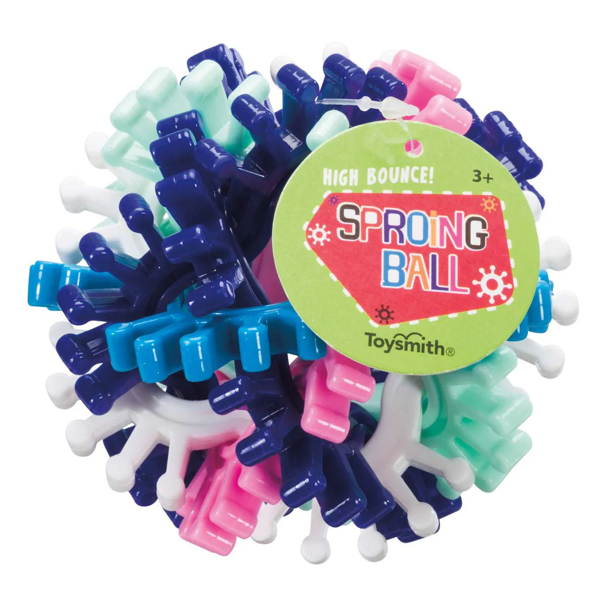 The Sproing Ball comes in an assortment of colors and is durable enough for bouncing indoors and out. These bouncy balls are made of interlocking rubber gears in a variety of colors. Each one features a mix of brightly colored gear pieces. Colors may include red, blue, green, orange, purple, pink, turquoise, dark blue, white, black, and more. An assortment of 12 comes with an orange, blue, black, and green display box.