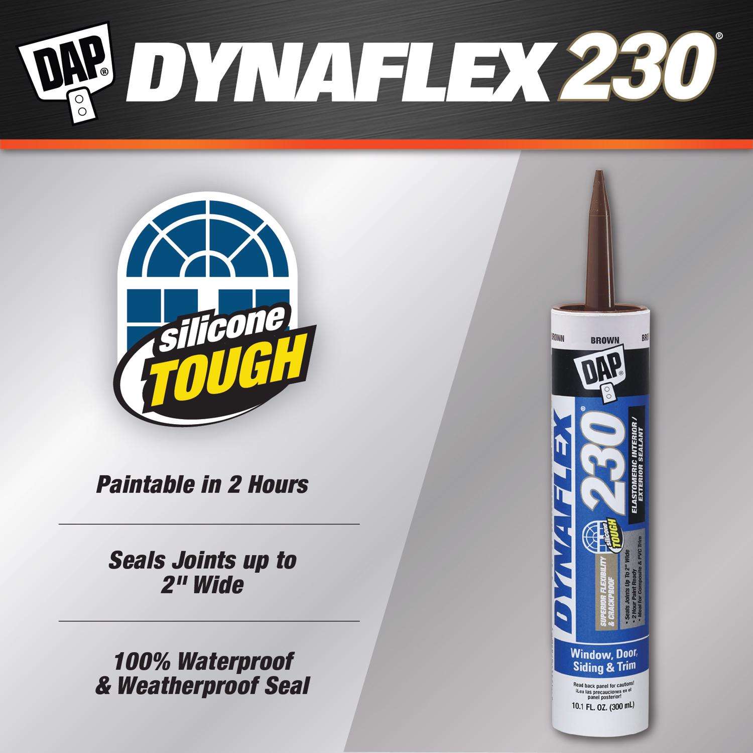 Dap Dynaflex 230 delivers a "Silicone Tough" latex formulation for outstanding exterior performance against the elements. Developed for flexibility and crack proof performance, this sealant endures expansion and contraction without cracking or losing its seal. The paintable, durable sealant can fill gaps up to 1 inch wide and the cured sealant is mold and mildew resistant. It has excellent adhesion to a wide range of building materials including wood, MDF, PVC, polystyrene and composite trim board. Easy to gun out, tools smoothly and can be cleaned up with soap and water. Interior/exterior use. Meets ASTM Specification C920, Class 25.