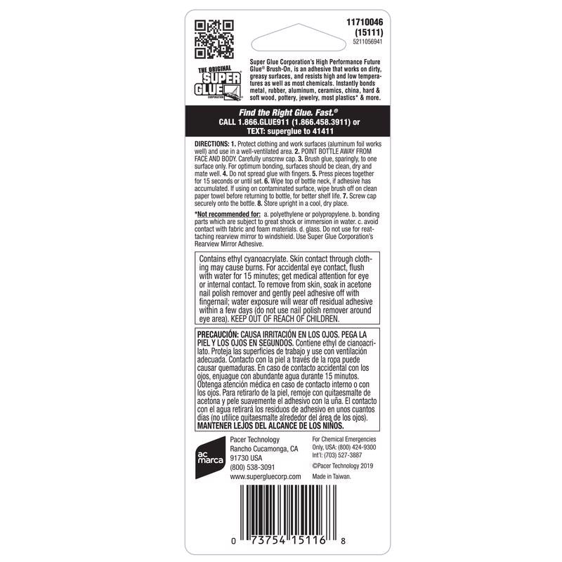 High Performance Future Glue Brush-On evenly and safely coats most surfaces while eliminating skin contact. Perfect for small and large surfaces needing a thorough coat of Future Glue. Its instant bonding power can be used for almost all porous and non-porous materials. Its powerful adhesive formula works on dirty, greasy surfaces, and resists high and low temperatures as well as most chemicals.
