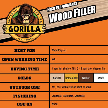 Gorilla High Performance Wood Filler is the go to product for strong, durable repairs on cracks, gouges and holes. The unique formula is easy to spread allowing for a smooth, natural finish. Its high performance stainability, paintability, and sandability provides you with a professional looking finished project.