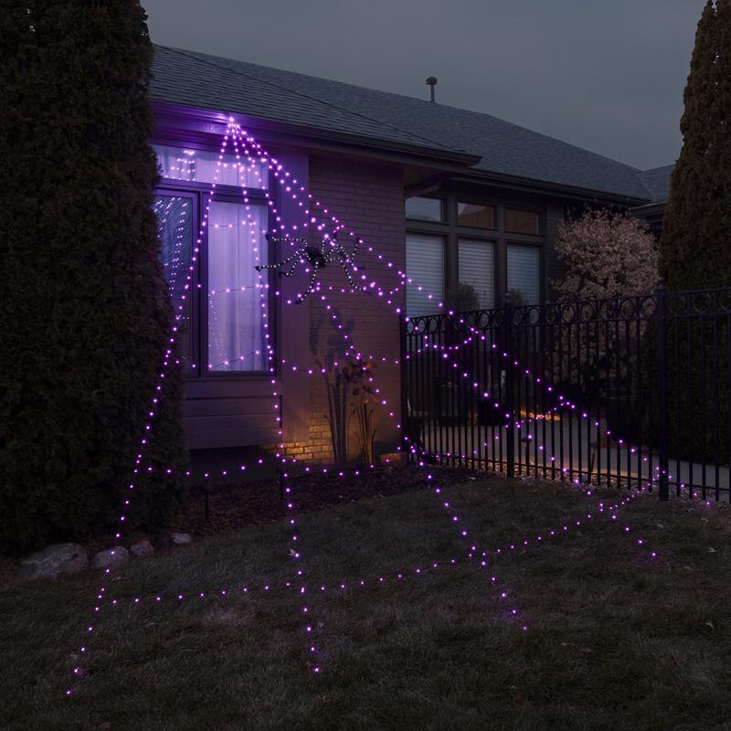 16 foot color changing purple to orange web with black spider with pure white lights.