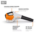 The BGA 250 features a max velocity of 190 mph and 26 Newtons of force, coming in at nearly twice the power of the BGA 86. The compact, lightweight design and ergonomic shape of the blower tube allows for comfortable operation. Featuring a convenient cruise control function for longer jobs, a weather-resistant design, reduced-noise operation, and producing only 60dB(A), the BGA 250 also offers compatibility with the STIHL Smart connector 2 A. Ideal for fleet management, this powerhouse blower is an excellent value for professionals and homeowners alike.