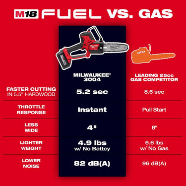 The Milwaukee M18 Fuel Hatchet 8 in. pruning saw delivers increased control and access, has the power to cut hardwoods and is the fastest cutting pruning saw. This pruning saw is designed to meet the ergonomic, performance and durability needs of the professional arborist, landscape maintenance professional and power utility linemen. Weighing less than 5 lbs without a battery and featuring a compact design, the cordless pruning saw provides increased control and maneuverability in tight access areas. The Powerstate brushless motor maintains speed under heavy loads without bogging down to complete demanding cuts faster than 25cc gas. The Redlink Plus Intelligence enables full-circle communication between the tool and battery, allowing for unmatched performance, protection and productivity levels. M18 Fuel technology enables the saw to reach full throttle in under 1 second and a variable speed trigger for ultimate control over the power range.