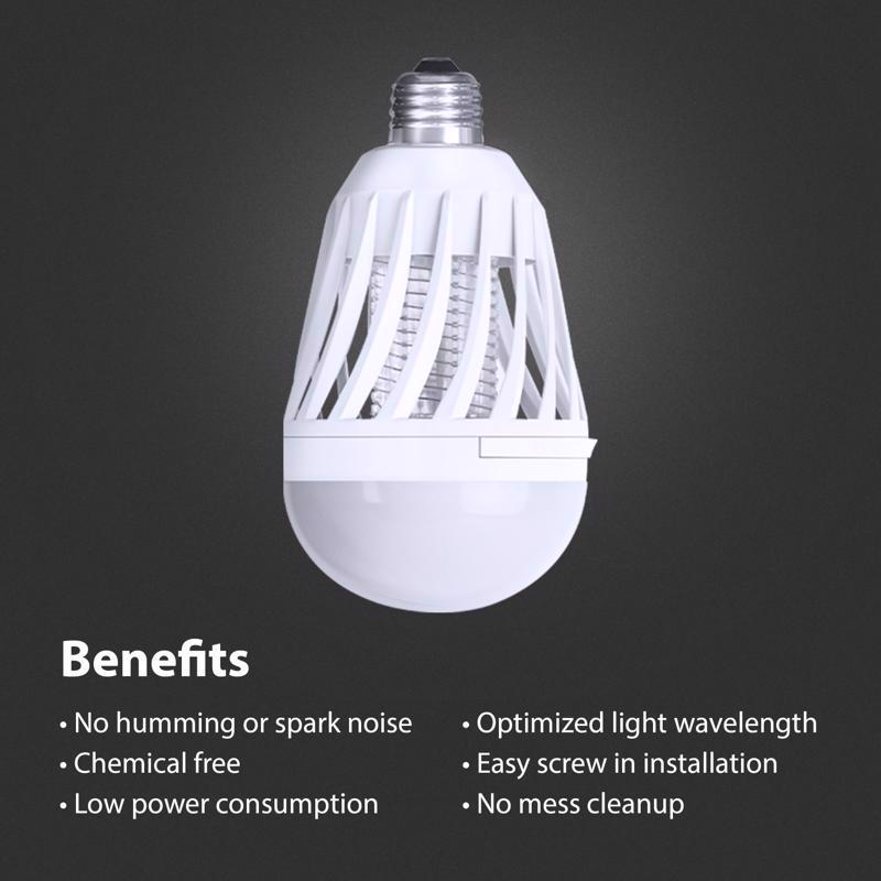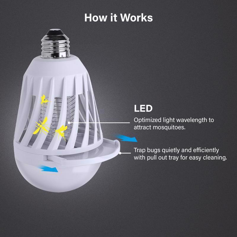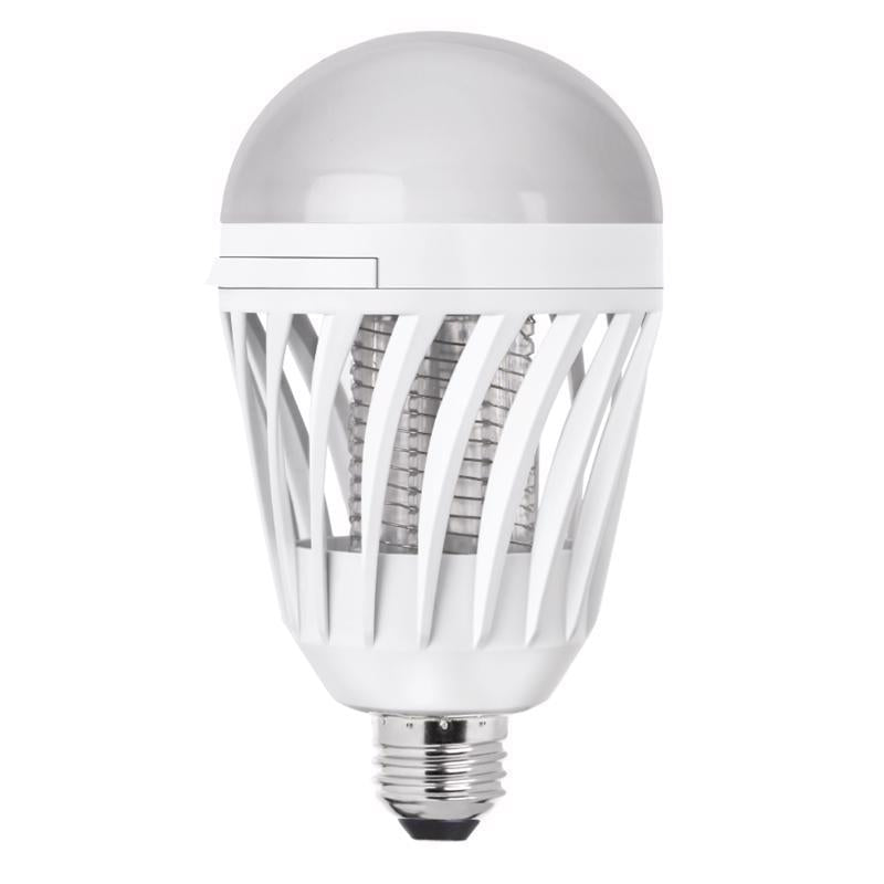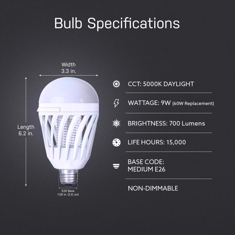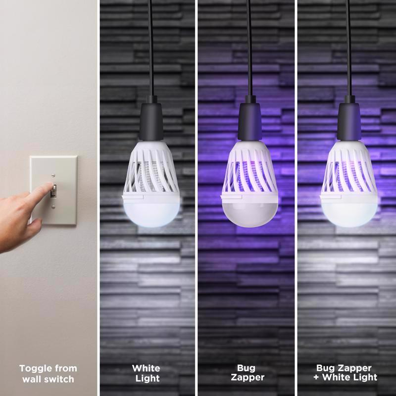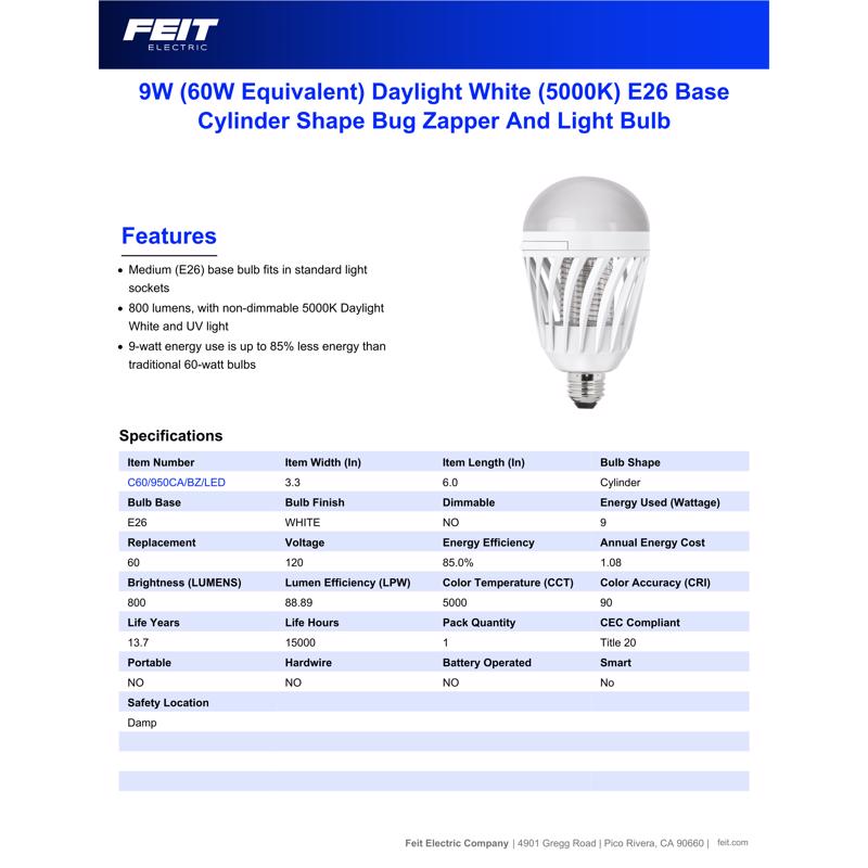 Zap away annoying bugs and insects with this advanced Feit Electric dual-purpose bug zapper and LED light bulb. Ideal for indoor or outdoor use, the zapper employs 5000K Daylight White light and blue UV light to attract flying insects and kill them on site. The bug zapper is a chemical-free solution with a protective outer cage for safe installation and a removable tray for hassle-free clean-up. This non-dimmable LED bug light will replace a 60-watt equivalent incandescent bulb using only 9 watts of electricity. With a 3-way switch control, you can change from LED-daylight light to blue UV light for zapper use or use combined light and zapper together. The Feit Electric C60/950CA/BZ/LED bug zapper has an average life of 15,000 hours, is RoHS compliant and is 100% mercury free.