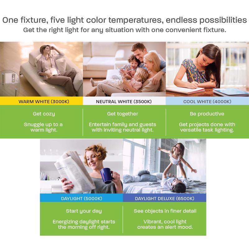 - Choose from 5 color temperatures; select before installation or use a standard wall switch to adjust