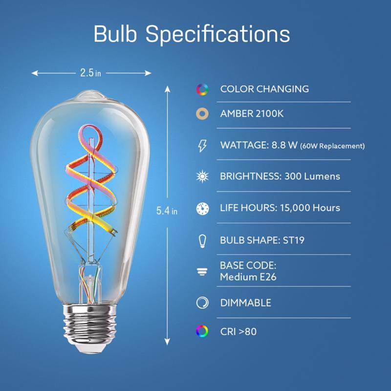 Upgrade your home to smart home technology with the elegant Spiral Filament Edison Style Light Bulb from Feit Electric. Easily turn lights on/off, dim, and set groups, timers, or schedules. Choose energizing daylight or wind down with relaxing soft white light. Get creative with millions of colors. Its all up to you. A stylish tapered design with clear glass and a curved filament instantly livens up the decor of any room. Use it in pendant lights, wall sconces, and uncovered lamps to show off this gorgeous light that looks as good on as it does off. Control lighting with voice commands through a smart assistant like Alexa or Google Home or use the Feit Electric mobile app for control at your fingertips. Set up is simple: bulbs connect directly to your home Wi-Fi using a 2.4GHz network only. Feit Electric Smart series ST2160/RGBW/FIL/AG filament light bulbs have an average rated life of 15,000 hours/13 years, are RoHS compliant, and are 100% mercury free. It has never been easier to customize your homes lighting to suit your lifestyle.