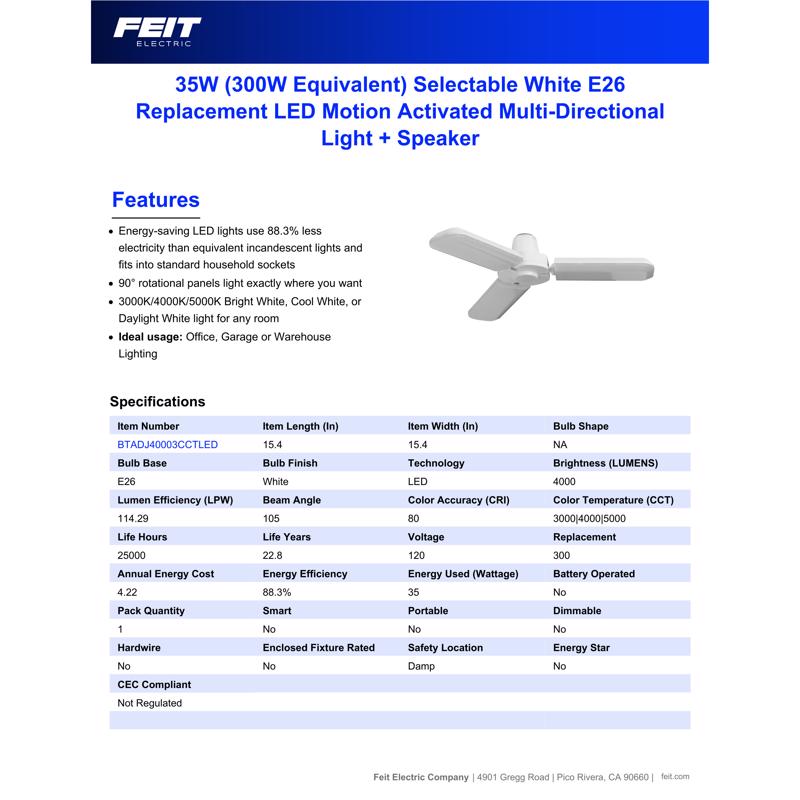 For garages, attics, patios, or other dark spaces, the Feit Electric BTADJ40003CCTLED Multi-Directional Light with Speaker provides an efficient and flexible way to get bright illumination in a small form. Play music, podcasts, and more with the connected Bluetooth speakers. No hub is necessary. The light screws into standard E26 sockets and comes with independently adjustable rotating panels that fold down up to 90 Degree Angle to direct light exactly where desired. Integrated non dimmable LEDs produce 4000 Lumens of 3000K/4000K/5000K Bright White, Cool White, or Daylight White light using only 35 watts an energy savings of up to 88.3 percent compared to equivalent 300 watt incandescent bulbs. Each light lasts up to 25,000 hours 22.8 years of bright, reliable illumination. The estimated annual energy cost is only 4.22 dollars, based on 3 hours of daily use.