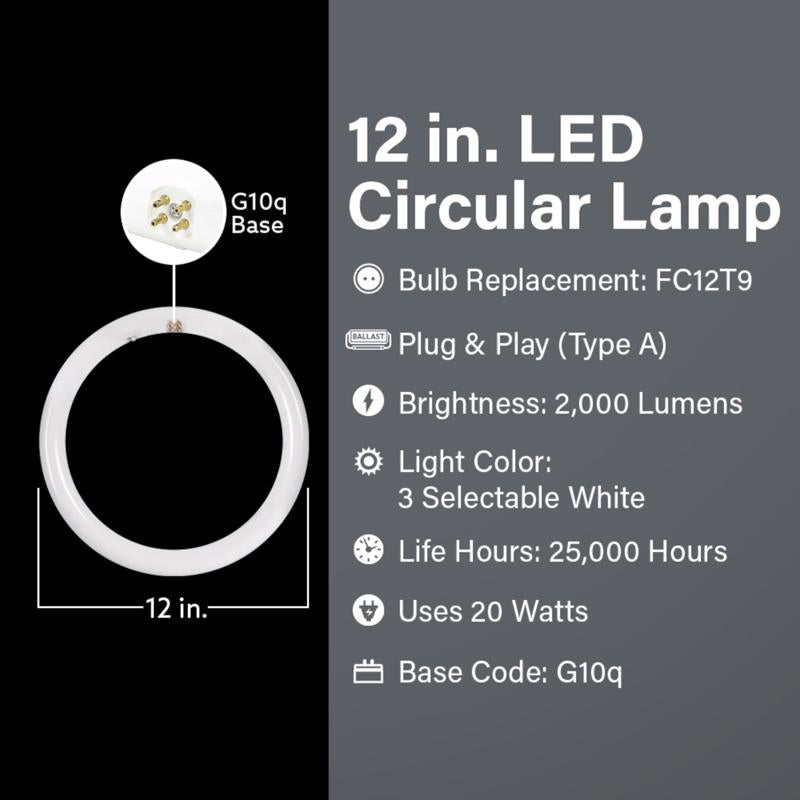 Upgrade fluorescent fixtures to the latest led energy-saving technology with the Feit Electric 20-watt (32-watt equivalent) 12-inch circline led light. These non-dimmable circular light tubes replace fc12t9 or t9 bulbs, ideal for ceiling fan and fixture applications. Choose between 3500k neutral white, 4000k cool white or 6500k daylight with the flip of a switch. Installation is easy simply plug the new lamp into the existing ballast. No replacement or removal of the ballast is required. These lights offer instant-on, flicker-free full illumination with no warmup time. Each high-quality bulb offers accurate color-rendering, for more vibrant, true-to-life colors. Enjoy lower maintenance costs compared to traditional fluorescent circline lights.