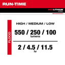- Three light output modes - high mode 550 lumens- 2.0 hours, medium mode 250 lumens- 4.5 hours, low mode 100 lumens- 11.5 hours
